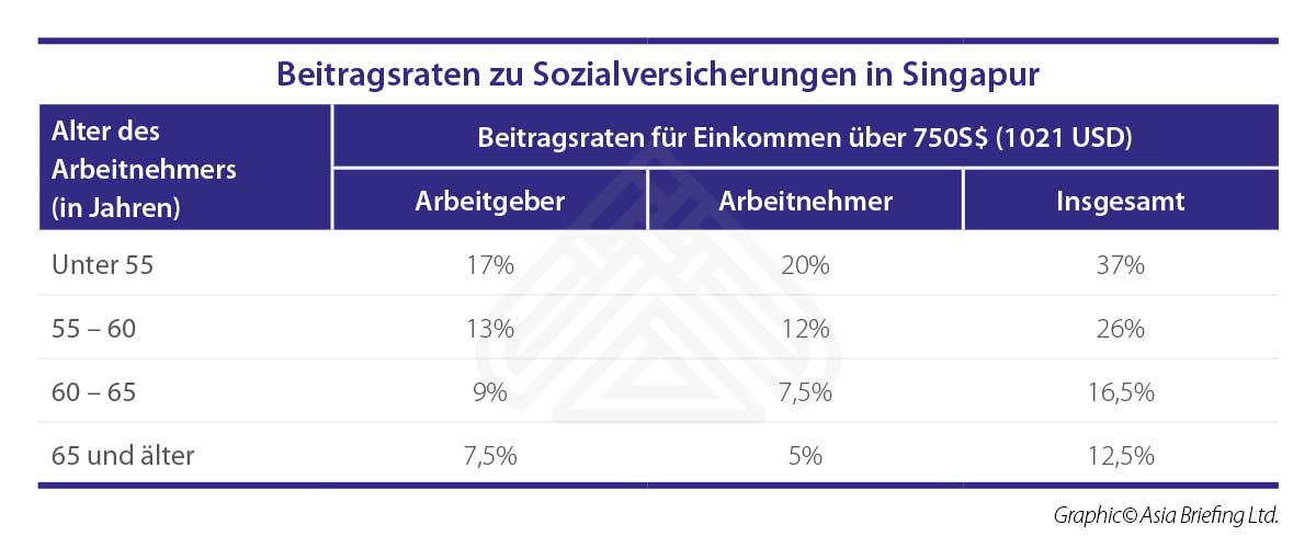 Die Beitragssätze werden gesetzlich festgelegt und variieren mit Alter, dem Lohn, dem Aufenthaltsstatus des Arbeitnehmers, Staatsbürger oder PR, und der Anzahl der Jahre, in der der Arbeitnehmer den Status als PR hält.