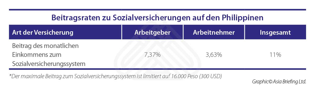 Das philippinische Sozialversicherungsgesetz verlangt sowohl von Arbeitnehmern also auch von Arbeitgebern die Beteiligung an dem Sozialversicherungssystem (SSS), dem nationalen Gesundheitsversicherungsprogramm und dem Home Development Mutual Fund, welcher Krankheit, Schwangerschaft, Arbeitsunfähigkeit, Rente, Tod und Beerdigungen, Krankenversicherung und Wohnbaukredite abdeckt. Die Beitragssätze werden auf Grundlage des Gehalts des Arbeitnehmers festgelegt. Dem Arbeitgeber ist es nicht erlaubt, seinen Beitrag von dem monatlichen Beitrag des Arbeitnehmers abzuziehen.