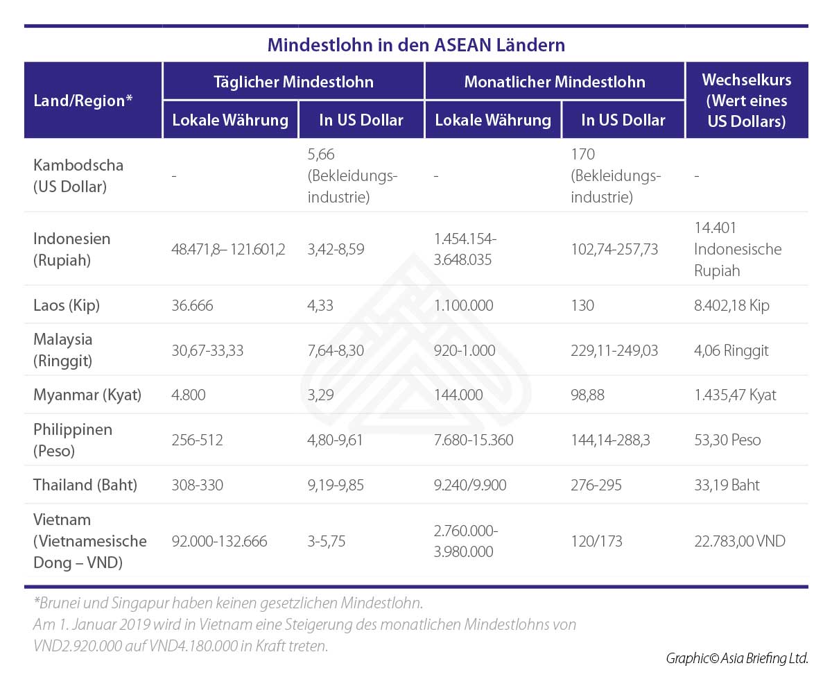 Die nachstehende Tabelle zeigt den aktuellen monatlichen Mindestlohn, sowie den täglichen Mindestlohn für Vollzeitbeschäftigte in den ASEAN-Staaten.