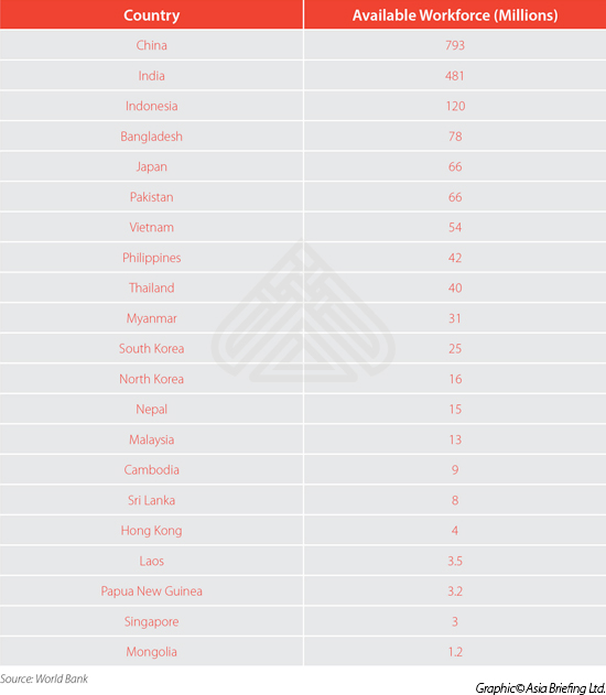 Die Auswirkungen der Verbreitung und der Herkunft verfügbarer Arbeitskräfte sind tiefgreifend. Die Anzahl verfügbarer Arbeitskräfte in Asien außerhalb Chinas – lange Zeit als „Werkstatt der Welt“ angesehen – übertreffen nun China um ein Vielfaches (Verhältnis von fast drei zu eins). Dies bringt ernsthafte strategische Überlegungen mit sich, da Chinas Erwerbsbevölkerung altert, teurer wird und sich verringert. Während sich einige Länder für ausländische Investoren als umständlich erwiesen – Pakistans große Arbeitnehmeranzahl ist wegen Sicherheitsbedenken nicht zugänglich, die Arbeiterschaft aus Nordkorea wird durch chinesische und russische Investoren unterstützt – haben große Teile von ASEAN, Indien und andere Regionen Südasiens wie Bangladesch und Sri Lanka, verborgenes Potenzial.