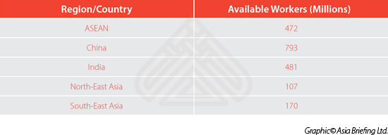 Ausländische Investoren beginnen genauer nach asiatischen Schwellenländern zu suchen, die eine Alternative zu China als Produktionsland darstellen. Vor dem Hintergrund chinesischer Personalerfahrungen können wir untersuchen, wo voraussichtlich zukünftige Arbeitnehmerpools herkommen werden und wie Arbeitnehmererfahrungen und Talente in Asiens Schwellenländern ausgetauscht werden können. Werfen wir zunächst einmal einen Blick auf die Zahl der verfügbaren Arbeitskräfte in Asien: