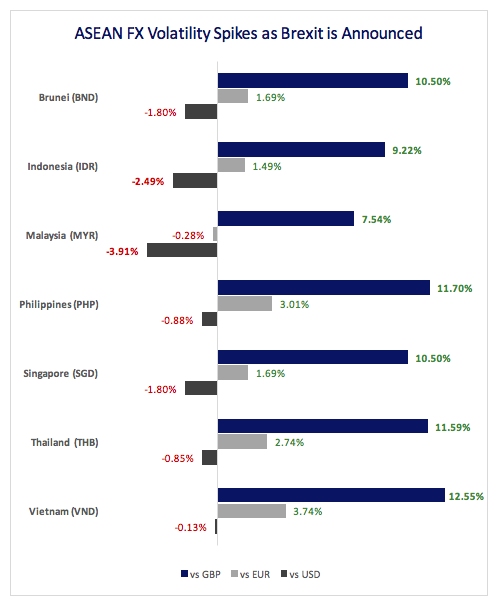 Come i mercati ASEAN hanno sperimentato fin troppe volte, la volatilità delle valute è una delle più immediate conseguenze di una qualsiasi crisi economica. Quando ancora i cittadini britannici erano impegnati nella votazione del referendum, i mercati, intimoriti dalla possibile “Brexit”, hanno inaspettatamente svalutato il cambio GBP/USD di sette punti percentuali, nonostante la sterlina sia una valuta a sé rispetto all’euro. Una volta chiusi i seggi, inoltre, tutte le valute dei Paesi ASEAN hanno registrato un apprezzamento nei confronti dei GBP.