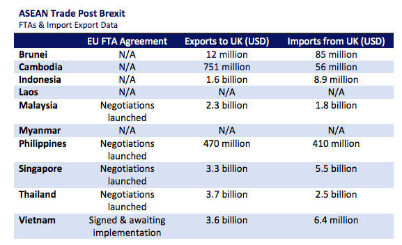 Innanzitutto, è bene chiarire che il Regno Unito è privo di un proprio network di accordi commerciali con le economie dell’ASEAN. Inoltre, numerosi progetti congiunti tra Unione Europea ed Associazione delle Nazioni del Sud-Est Asiatico sono ancora in corso di realizzazione o addirittura di negoziazione. Attualmente, in effetti, l’Unione Europea sta discutendo le condizioni per degli imminenti accordi commerciali con alcune delle principali economie dell’area ASEAN, tra cui Malesia, Singapore, Thailandia e Filippine.
