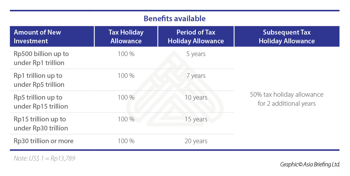 Investments starting from Rp500 billion (US$36.4 million) up to under Rp1 trillion (US$72.5 million) can enjoy exemption from CIT for the first five years, while those investing more than Rp30 trillion (US$2.2 billion) can enjoy a maximum CIT exemption for 20 years.