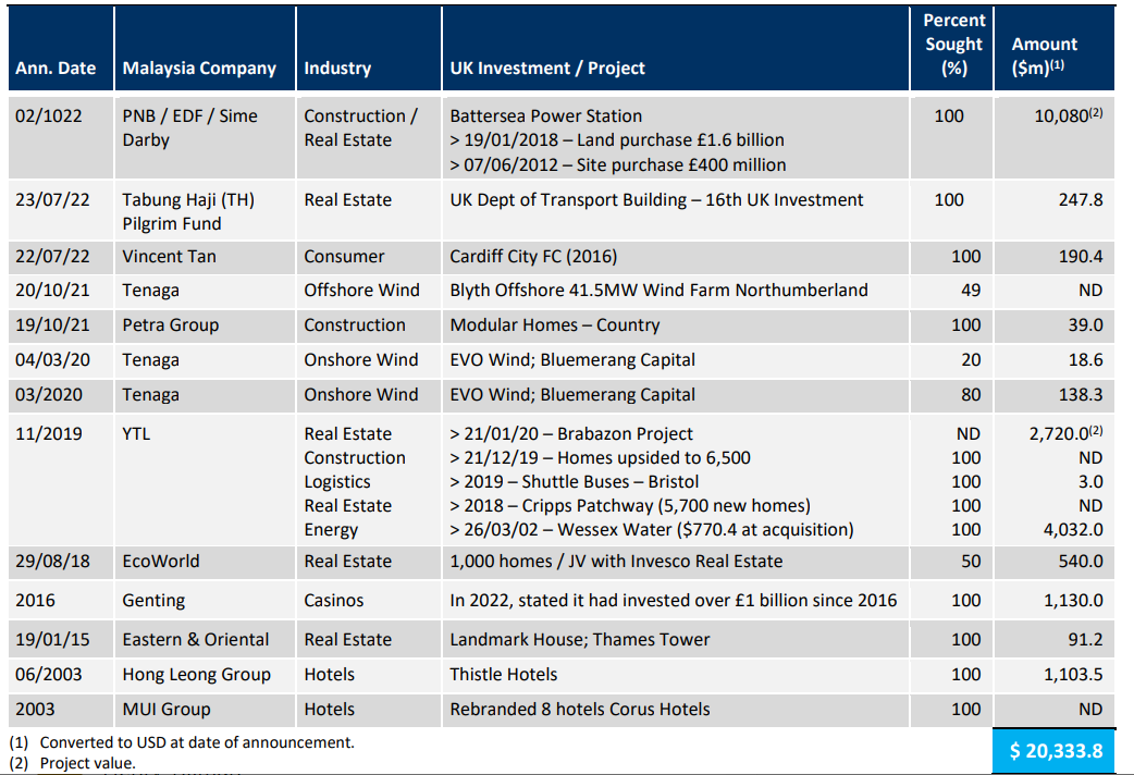 Historically, the majority of Malaysian investment into the UK over the past two decades has been led by the real estate and construction segments. These have been followed by hotels, consumers, and gaming. Over the past five years, Malaysia has been increasingly investing in UK renewables, led by YTL in Bristol (owner of GENeco waste to energy).