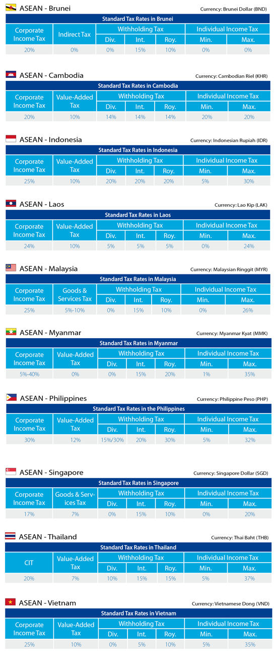 In this article, we outline the key corporate and individual income tax rates for the 10 member states of the Association of Southeast Asian Nations (ASEAN) – Brunei, Cambodia, Indonesia, Laos, Malaysia, Myanmar, the Philippines, Singapore, Thailand and Vietnam.