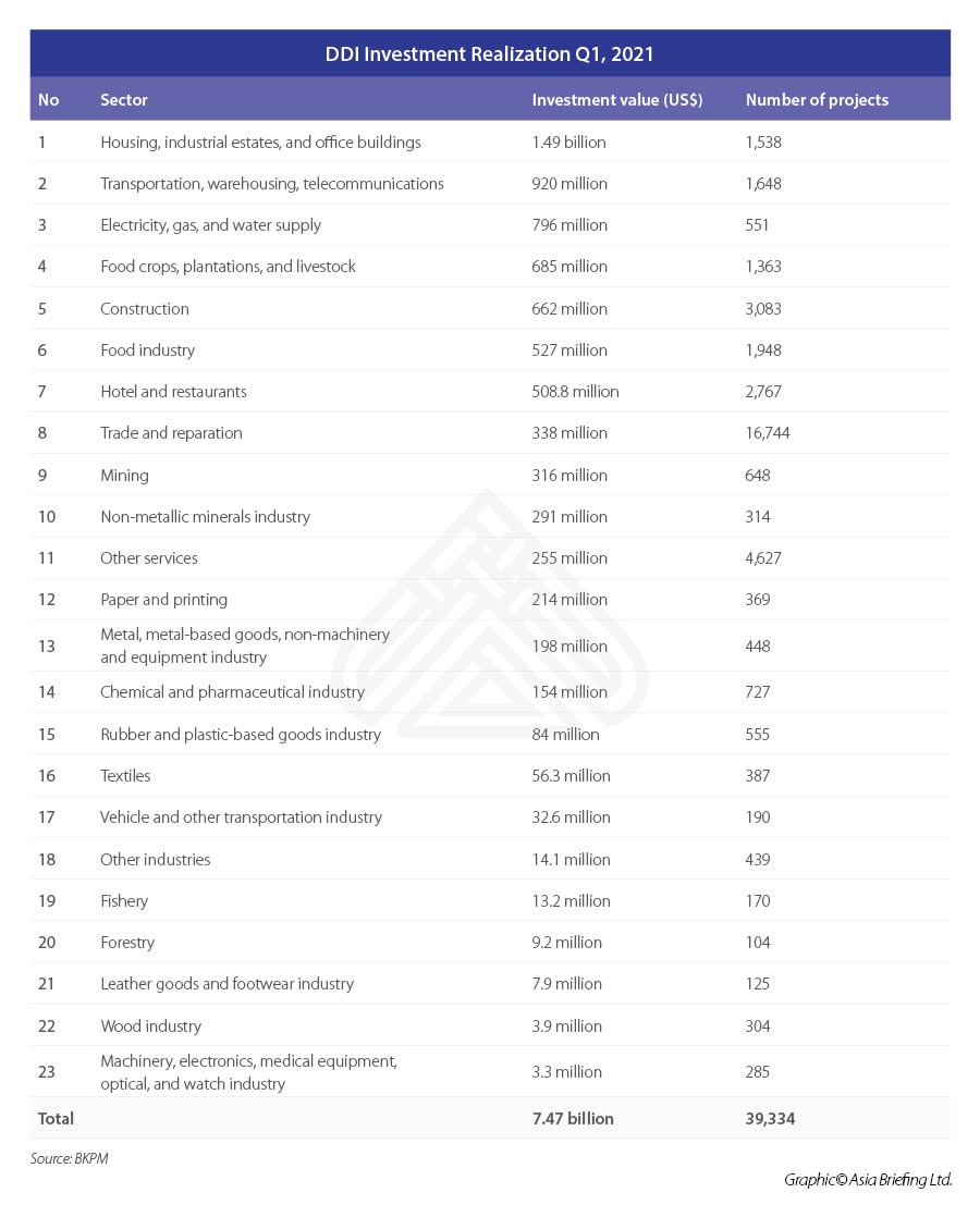 Total investment realization for Q1 of 2021 has seen an uptick compared to the same period in 2020. Between January and March, Indonesia saw a total investment realization of 219.7 trillion rupiah (US$15.20 billion), an increase of 4.3 percent, or 210.7 trillion (US$14.58 billion). This is already 25 percent of the government’s 2021 investment target.
