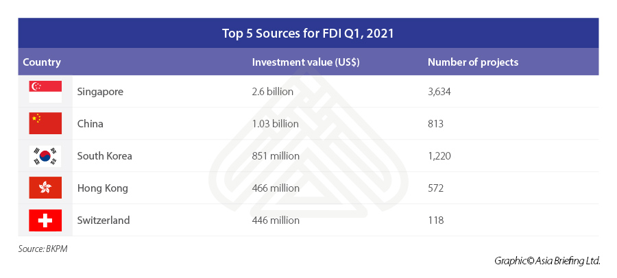 Data from the BKPM showed that FDI and DDI investments outside the island of Java increased by 11.7 percent compared to Q12020 and that manufacturing dominated Indonesia’s total investment realization, namely in the metal, metal-based goods, non-machinery and equipment category, food manufacturing, as well as automobile manufacturing. Further, investments in housing, industrial estates, and office buildings contributed to 29.4 trillion rupiah (US$2 billion).Singapore continued to be the number one source of FDI for this period with US$2.6 billion in investments for 3,634 projects. China came second with just over US$1 billion. Surprisingly, Switzerland for the first time came in fifth with close to US$ 500 million in investments for 118 projects. According to the BKPM, Q1 investments have created more than 300,000 new jobs.