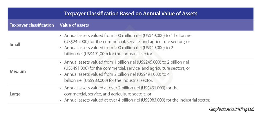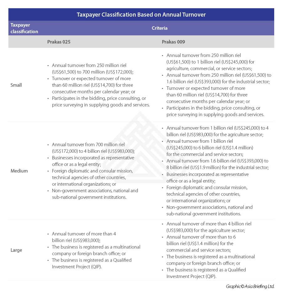 In January 2021, the tax authority issued new criteria to classify taxpayers under Prakas 009, which replaces Prakas 025. Taxpayers are assessed on their annual turnover or the value of their assets. They are then classified into small, medium, or large taxpayers.