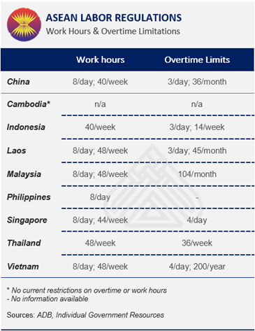 In conjunction with wages differentials, the ability to leverage ASEAN’s young and educated workforce is largely dependent upon regulations found within respective member states. With direct cost implications for labor intensive investment projects, overtime limitations are among the most important considerations for potential investors.
