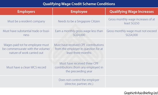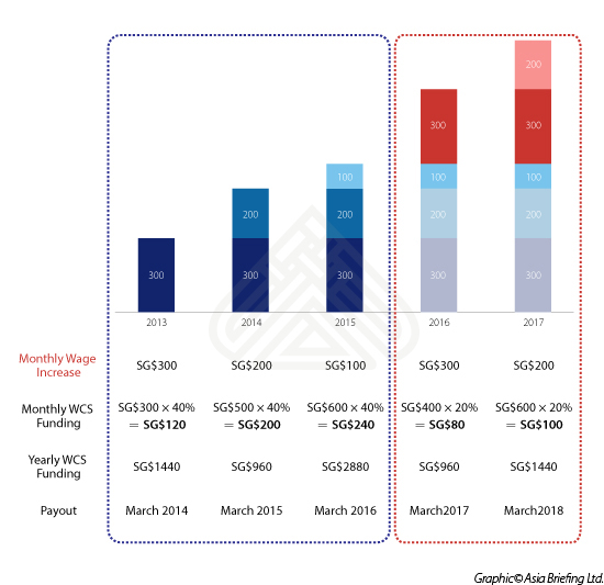 For example, a company which hired a new employee in January 2012 who received a gross monthly wage increase of SG$300 in 2013, SG$200 in 2014 and SG$100 in 2015. For 2015, the employee’s monthly government co-funding would be SG$240 – which translates to SG$2880 per year, since it also includes the incremental wage increase granted in the two previous years. The 40 percent Wage Credit for 2015 is computed not only based on the SG$100 salary hike of 2015, but on SG$600, including the SG$300 and SG$200 wage raises from 2013 and 2014, respectively.