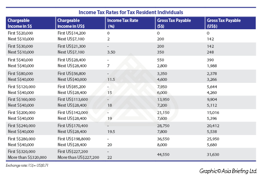 Singapore’s tax system is progressive in nature, which means higher income earners pay a proportionately higher tax, with taxes currently ranging from zero to 22 percent. Individual income tax in Singapore is payable on an annual basis and is imposed only on the income sourced within the country. The income earned outside Singapore is exempt from taxation.