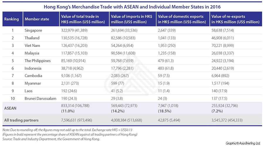 Since 2012, the re-exports of goods of ASEAN origin through Hong Kong to China have risen at the rate of 6.4 percent annually on average. In 2016, 12 percent of trade between ASEAN and Mainland China, with a value of over US$54 billion, was routed through Hong Kong.