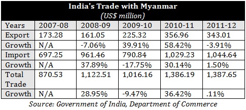 In 2012, India and Myanmar signed 12 MoUs extending cooperation on border development, defense and analysis and joint trade and investment. Bilateral trade between India and Burma is expected to more than double by 2015, growing from $1.28 billion in 2011 to $3 billion.