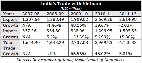 Bilateral trade has increased since then, and India has taken a place among the ten largest exporters to Vietnam. Two-way trade reached $4 billion in 2012, with Indian exports accounting for $2.34 billion while Vietnam’s exports accounted for $1.56 billion (up from $178 million in 2002). The two sides have set a target of $7 billion for bilateral trade by 2015, and, with the signing of the India-ASEAN FTA on trade in goods in 2010, bilateral trade is poised to grow at an even faster rate.