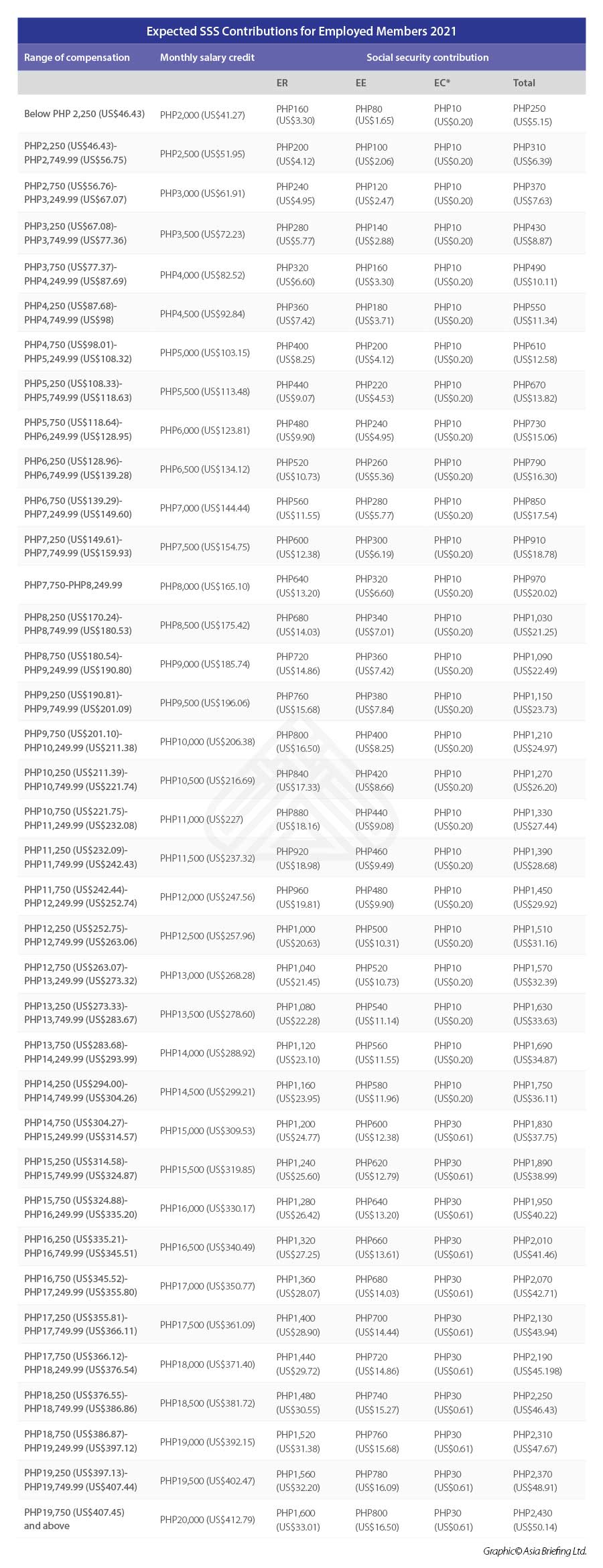 The SSS premium for employers and employees will differ depending on the employee’s monthly compensation bracket. The SSS was scheduled to increase the premium rate by one percent for 2021, before the suspension. This is in accordance to Social Security Act of 2018, which was signed by the President in 2019, and which allowed the pension fund to increase the premium contribution rate by one percentage point every other year starting in 2019 until it reaches 15 percent.