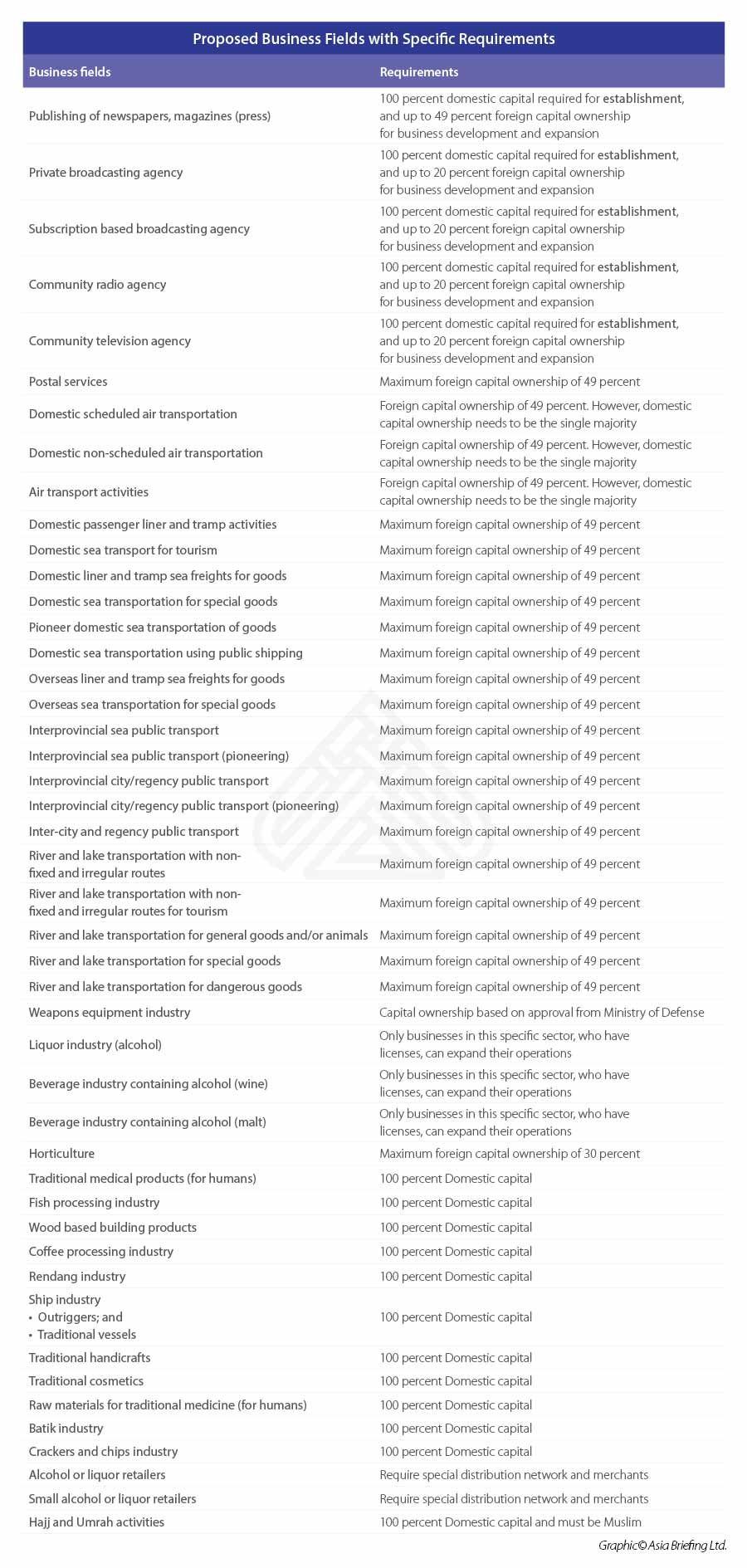 - The capital required for business activities must not exceed 10 billion rupiah (US$709,000). This excludes land and property;