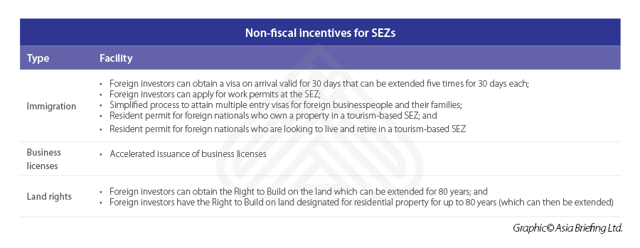 The government has also provided a number of SEZ-specific fiscal and non-fiscal incentives for investors.