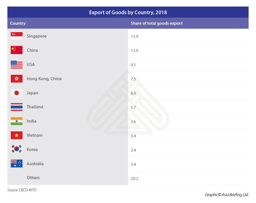 Singapore, China, the US, Hong Kong, and Japan are the top five export destinations of Malaysia’s products. Continent-wise, in 2018, 72.2 percent of Malaysian exports by value were delivered to Asian countries, while 10.6 percent to Europe and 10.3 percent to North America.