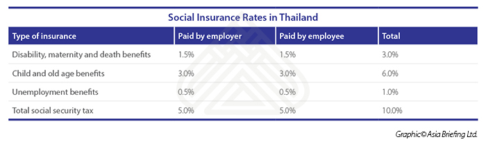 Employers are generally required to register their employees with the workmen compensation fund and social security fund. Both employers and employees are required to contribute to the Social Security Fund at the rate of 5 percent of the employee’s income, up to a maximum of THB750 (US$23) per month.