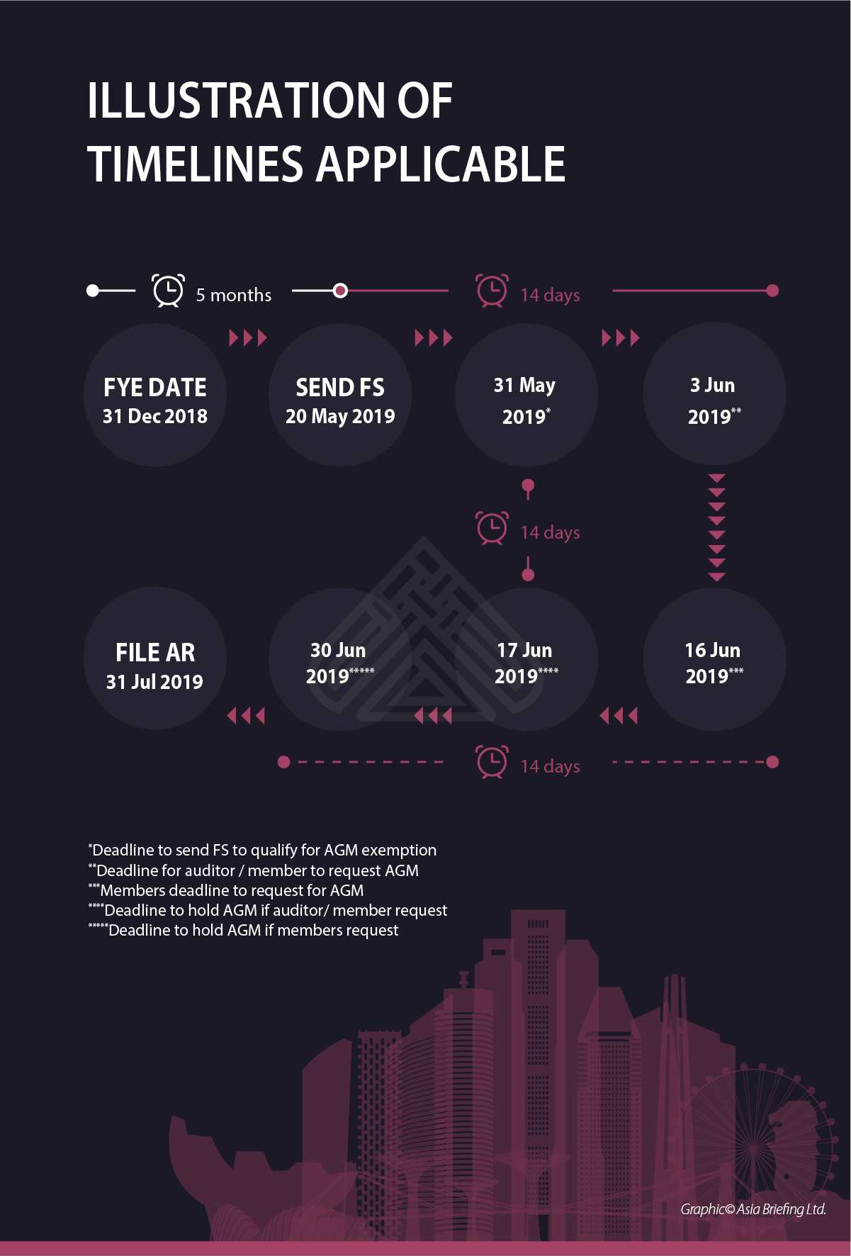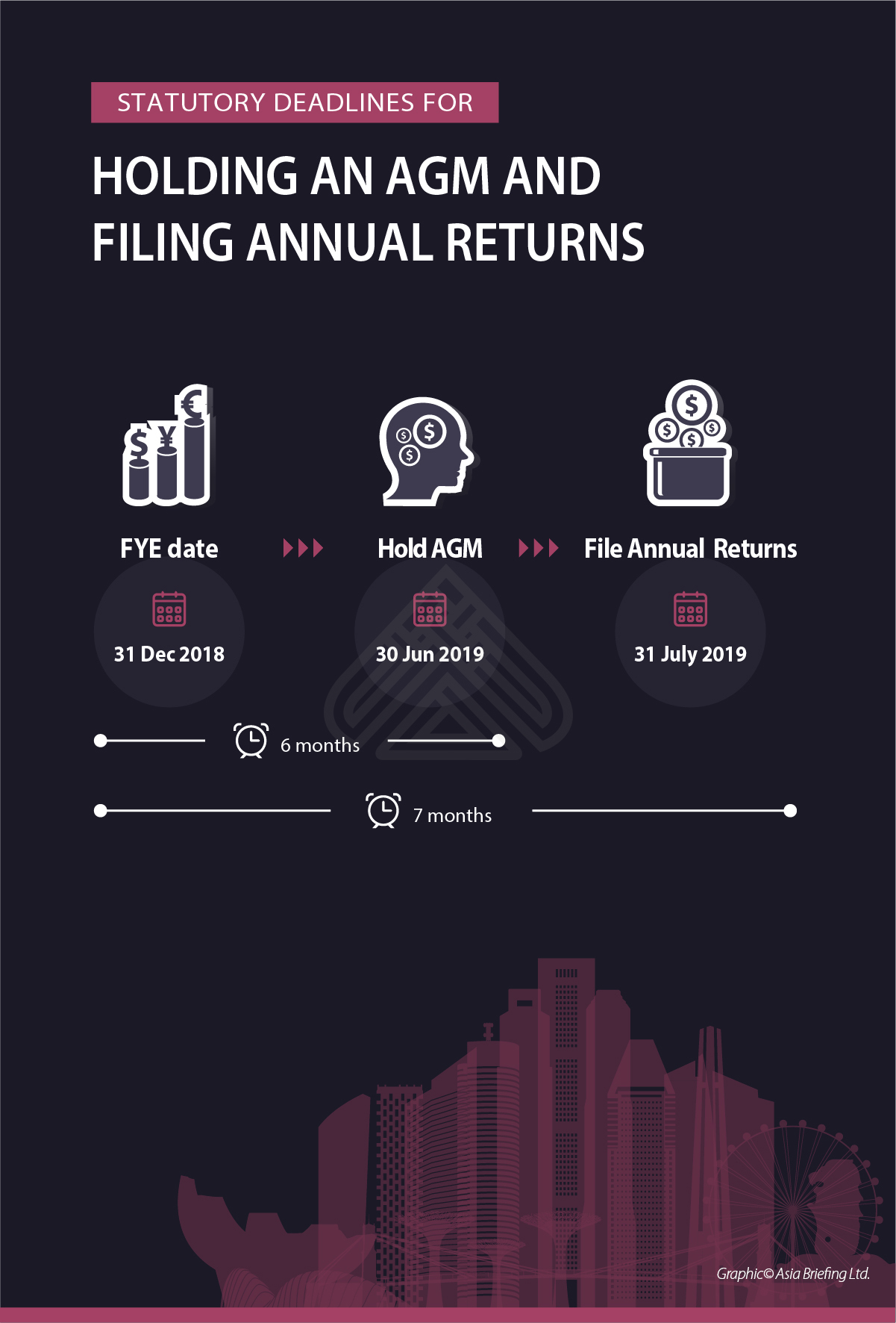 With the new legislations in place, the statutory deadlines for holding an AGM and filing annual returns are illustrated below:Important information on changing the FYE date: