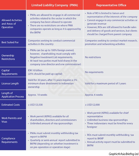 Foreigners are allowed to set up two different types of legal entities in Indonesia:
