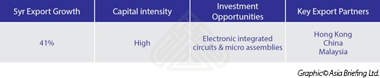 Famous for its business friendly policies, infrastructure, and highly educated workforce, Singapore has long been the home of capital intensive electronics production within ASEAN. In 2014 total electronics exports reached US $124 billion, amounting to 45 percent of ASEAN’s electronics sales and 30 percent of the city states’ total exports. Key trading partners include Hong Kong, China, and Malaysia which import more complex components that can be assembled into finalized products. This position has become more pronounced in recent years with strong growth in several of Singapore’s most important product lines such as Integrated circuits and Micro Assemblies.