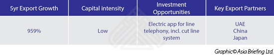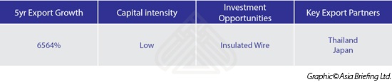 With a recent push for investor friendly reforms and highly competitive labor costs, Cambodia provides unique opportunities for investors looking to set up low cost production operations in South East Asia. Although comprising a small percentage of total ASEAN electronics exports, the last five years have seen exponential growth in low value added electrical production. Insulated wiring has been at the forefront of this growth and Cambodia is rapidly becoming a production hub for importers in Thailand and Japan.