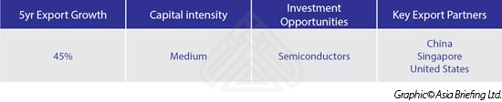 As Malaysia’s position as a low cost production location for high value added components becomes more pronounced, semiconductor production presents an increasingly lucrative investment opportunity. Since 2009, the entrance of major (MNCs) and such as Intel, AMD and Texas Instruments, and investments of Malaysian-owned companies such as Silterra, Globetronics, and Unisem have contributed to a 64 percent increase in semiconductor exports. To date, there are more than 50 companies have established semiconductor production within Malaysia with exports reaching US $7.8 billion in 2014.