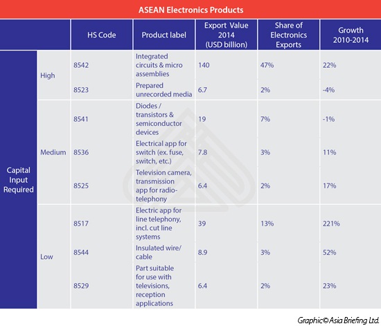 As of 2014, capital intensive electronics production accounted for the majority of ASEAN exports. Key industries such as integrated circuits and micro assemblies have seen strong growth and provide opportunities for scaling in the coming years. Alternatively, production lines with intermediate capital requirements are seen to be in the process of reorientation. Traditionally dominant lines of production have seen growth slowing in the face of more competitive alternatives such television camera and radio receiver components. Although making up a smaller portion of ASEAN exports, labor intensive segments of electronics production – such as insulated wire manufacturing – have seen explosive growth in recent years and present new investment opportunities in several key markets.