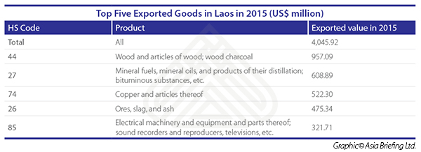 According to data from the International Trade Centre (ITC), Laos’ exported value in 2015 was US$4.05 billion. Wood, articles of wood, and wood charcoal was the most exported good by value, followed by mineral fuels, mineral oils, and products of their distillation, and copper and articles thereof.