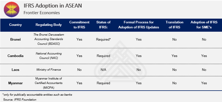 The state of IFRS harmonization in ASEAN’s frontier economies ranges widely. Some nations such as Laos have yet to establish a clear means of implementing International standards, while others have achieved full compliance with IFRS as well as IFRS for SMEs.