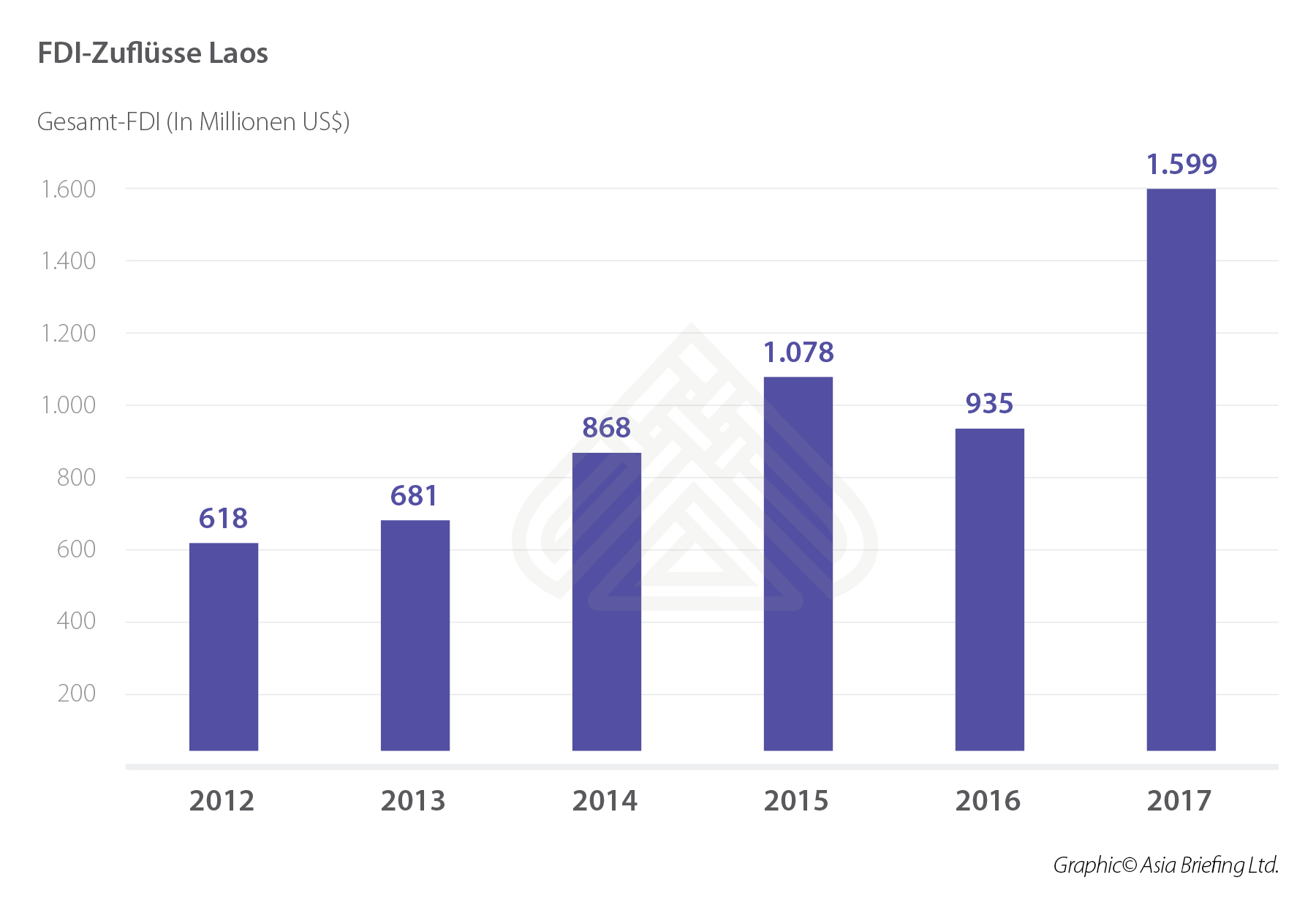Mit seiner Nähe zu China bietet Laos deutschen Herstellern die Möglichkeit, den chinesischen Markt sowie Fabriken in China kostengünstig zu beliefern. Geringe Löhne und eine gute Energieversorgung machen Laos zunehmend attraktiver. Die FDI-Zuflüsse nach Laos steigen seit 2012 stetig an und zeigen immense Möglichkeiten für die Zukunft des Landes.