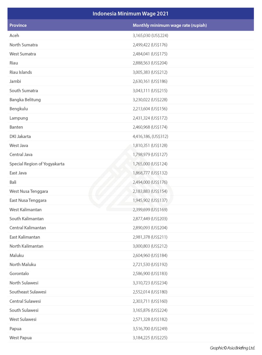 - Indonesia has increased the monthly minimum wage rate for only five provinces for 2021: Jakarta, Yogyakarta, South Sulawesi, Central Java, and East Java.