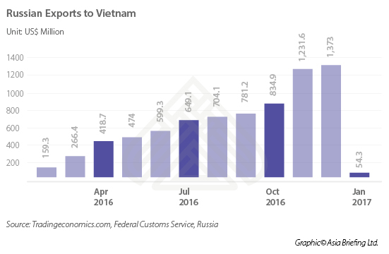 Vietnam is currently the only ASEAN nation to have an FTA with the EAEU, coming in to effect in early 2016. Since then, bilateral trade between Vietnam and Russia, in particular, has increased, with Russia investing US$10 billion in Vietnamese projects. Russian exports to Vietnam have also shown a sharp increase since the FTA was agreed: