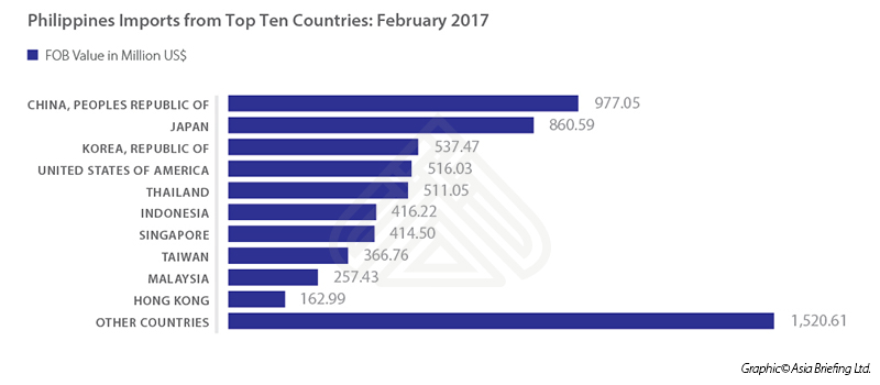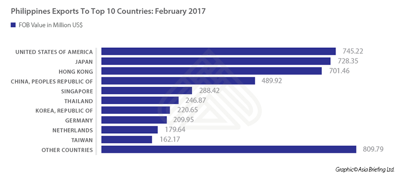 The two graphs below, issued by the Philippine Statistics Authority (PSA), give the February 2017 figures for the top 10 trading countries (including Hong Kong, China). Hong Kong ranked third with US$701.46 million or 14.7 percent share of the total exports. It grew by 66.6 percent from US$421.06 million in the same month a year ago.