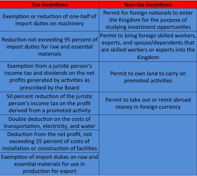 All subgroups receive an exemption from import duty on machinery, a one-year of exemption of import duty on raw or essential materials used in manufacturing export products, and other non-tax incentives.