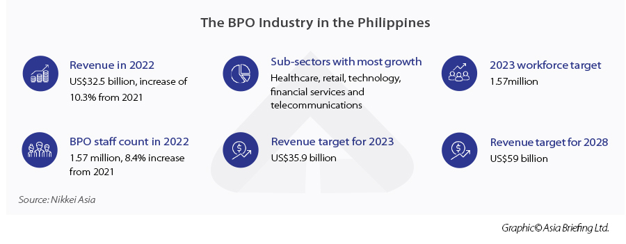 The BPO industry in the Philippines is important for the country’s economy and contributed around US$32.5 billion in 2022, an increase of 10 percent from 2021. The industry has improved its capacity to offer non-call center outsourcing solutions and is ripe for investments into more value-added levels of outsourcing, namely knowledge process outsourcing (KPO). This comprises of IT outsourcing, animation game development, financial research, software development, and data analytics, among others.