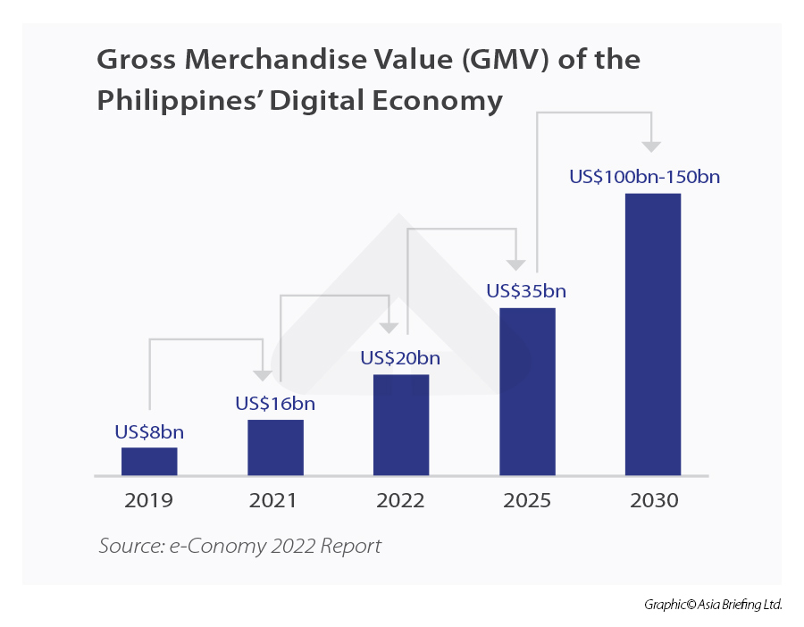 The Philippines’ digital economy had a gross merchandise value (GMV) of US$20 billion in 2022, at a compound annual growth rate (CAGR) of 22 percent. The GMV is expected to rise to US$35 billion in 2025 and between US$100 billion to US$150 billion by 2030.