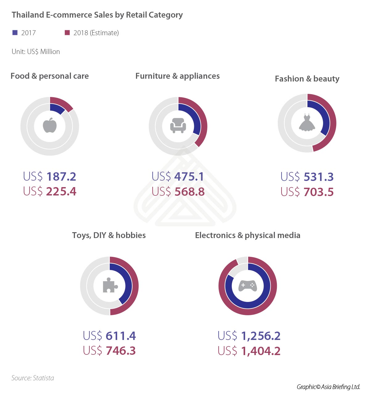 The variety of products sold on e-commerce platform is, too, expected to grow significantly. Some of the key verticals of the Thai e-commerce industry are discussed below.