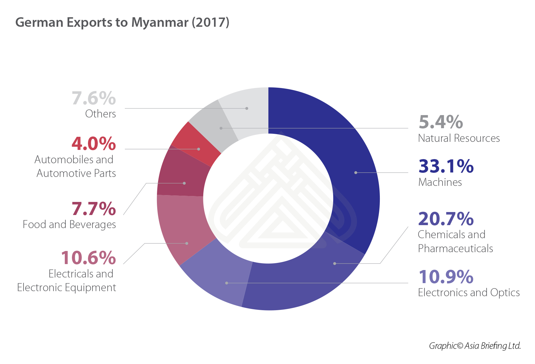 In 2018, Germany exported goods worth US$144.5 million, though exports have been declining in recent years. On the other side, German imports increased to US$1 billion in 2018, which is a significant improvement on previous years. German imports from Myanmar are largely focused on textiles and footwear.
