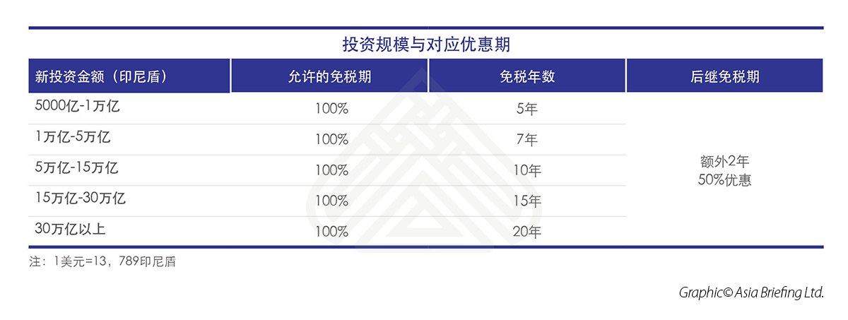 从5000亿印尼盾(3640万美元)到1万亿印尼盾(7250万美元)以内的投资可享受前五年免除所得税,而超过30万亿印尼盾(22亿美元)的投资可享受最高20年所得税豁免。