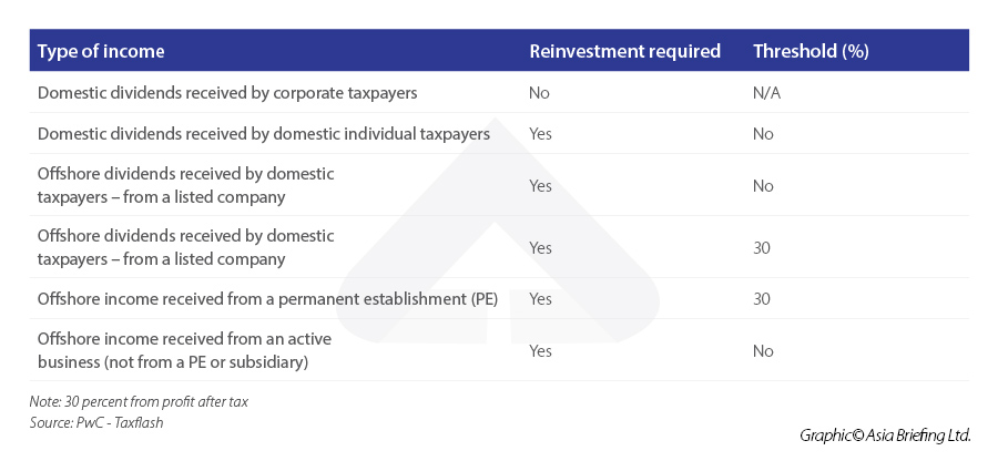 The investment must be held for a minimum of three years from when the dividend or offshore income is received. The taxpayer must also invest the dividend or offshore income in the qualifying investments by the end of the third or fourth month after the end of the fiscal year. Finally, the investment cannot be transferred except to another qualifying investment.