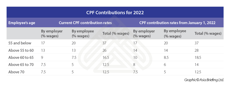 From July 2022, the retirement and re-employment ages will increase to 63 and 68, respectively, and 65 and 70 by 2030. Singapore’s Manpower Minister Tan See Leng told Parliament that the increase in the retirement and re-employment ages was necessary – particularly as by 2030, one in four Singaporeans will be 65 and older, resulting in talent shortages and hurting the country’s productivity and competitiveness. Businesses can raise their retirement and re-employment ages ahead of the scheduled timeline. In early 2021, the government announced that the CPF contribution rates for employees aged 55 to 70 years will increase earning more than S$750 (US$553) per month, starting from January 1, 2022.