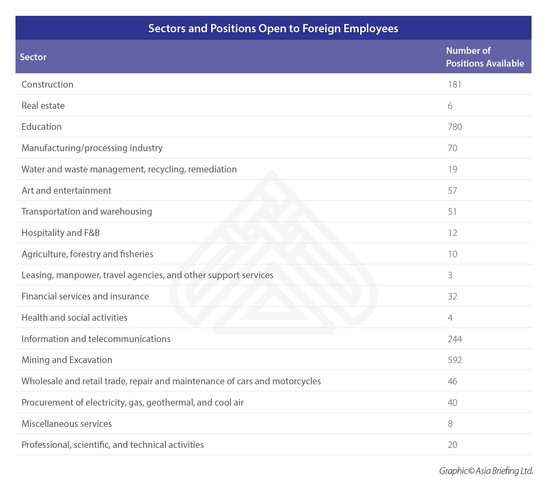 Foreign employees in Indonesia are not allowed to obtain work in the following sectors: