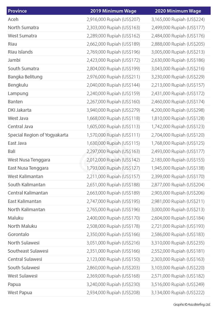 - By January 2020, Indonesia will increase its minimum wage by 8.51 percent from the current 2019 rate.