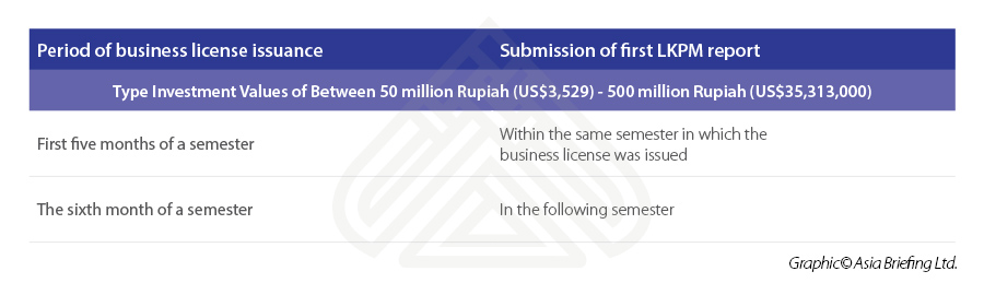 The period of a company’s first submission of their LKPM report will depend on when they were first issued a business license by the BKPM as well as the value of their investments.