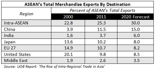 The establishment of free trade across ASEAN by 2015 is a major factor underpinning this evolution of higher intra-regional trade. We have written about these issues and the impact they will have on China and throughout Asia in our recent piece “China to Join RCEP Creating Massive Free Trade Area.” Although the free flow of most trade goods can be expected, there may still be some resistance to banking and telecommunications, although within ASEAN and its other trade partners such as China and India, talks are underway to find common ground. The statistics presented below are likely to resonate beyond 2020, however, as by that time the ASEAN member state Indonesia is expected to become one of the world’s top 10 largest economies, when its GDP alone is expected to reach US$3 trillion.